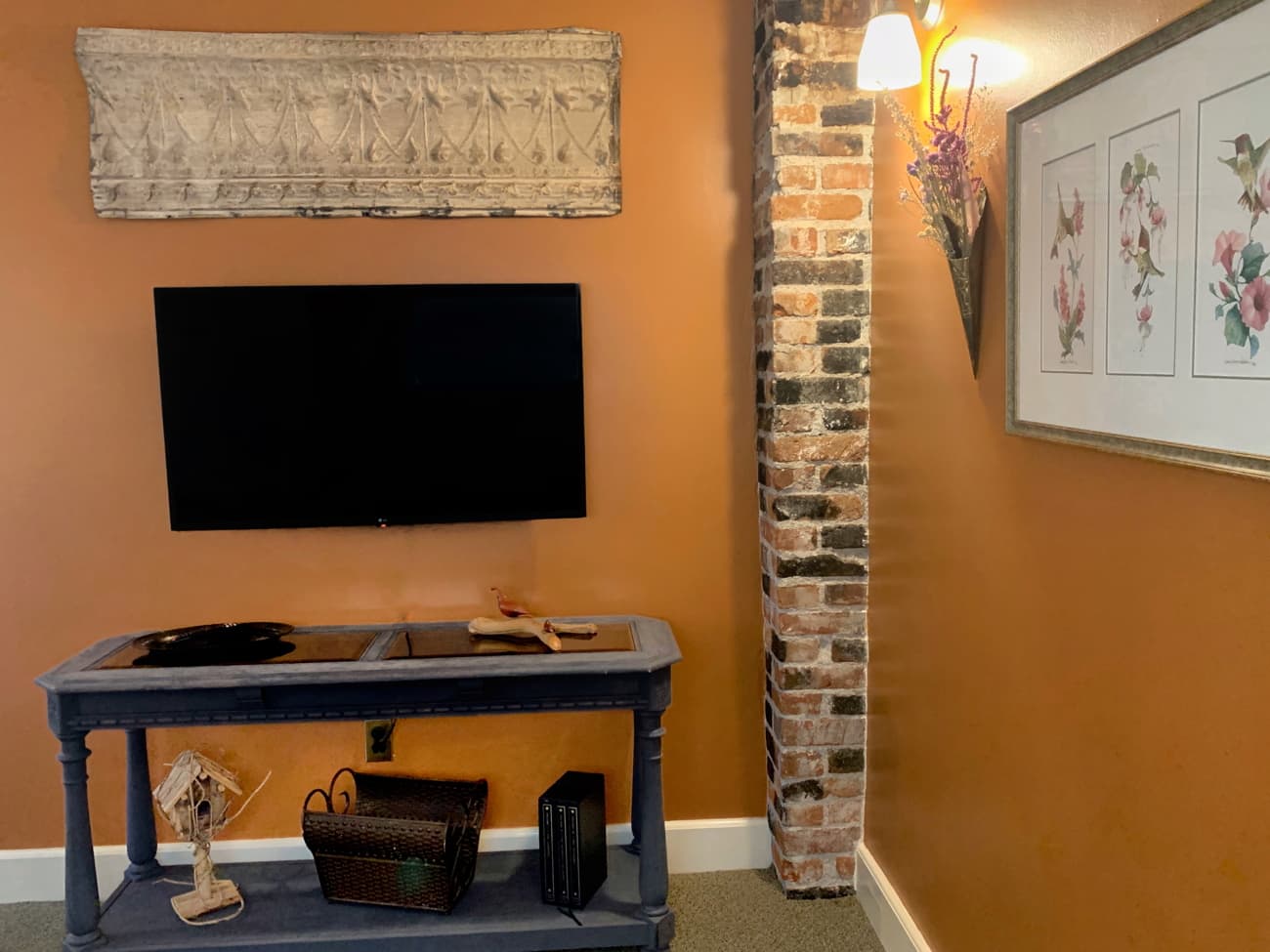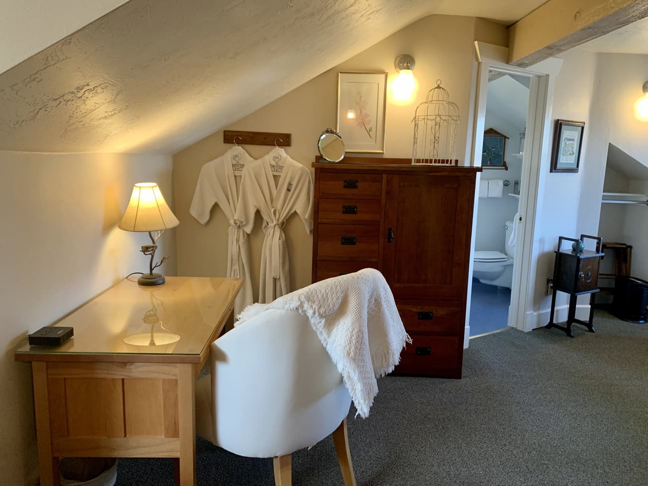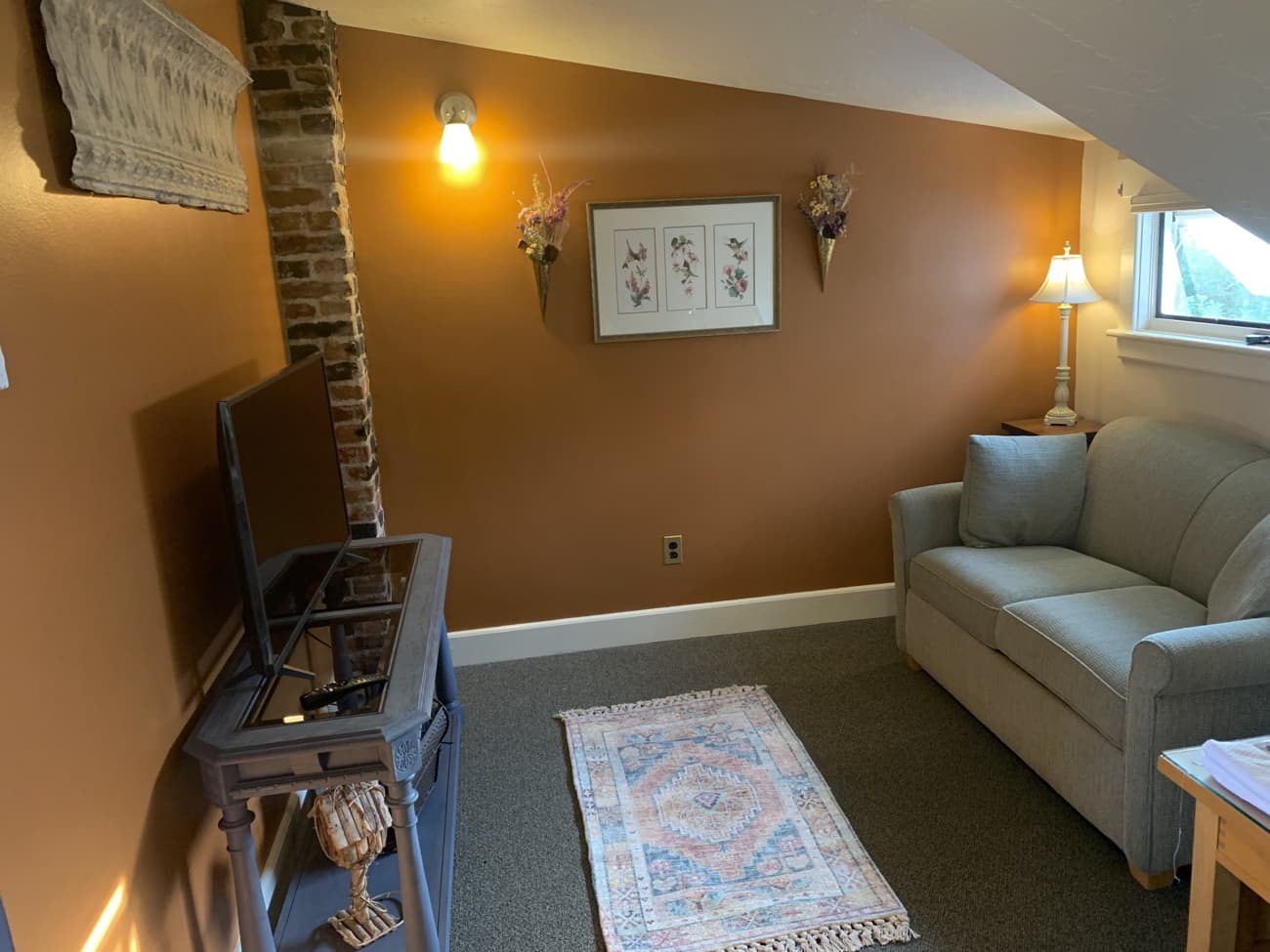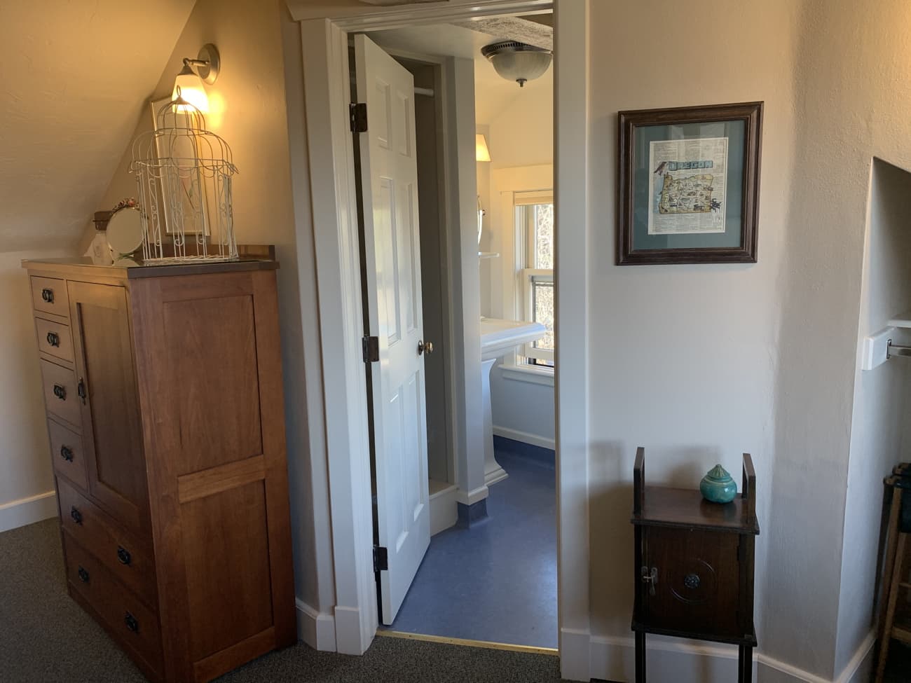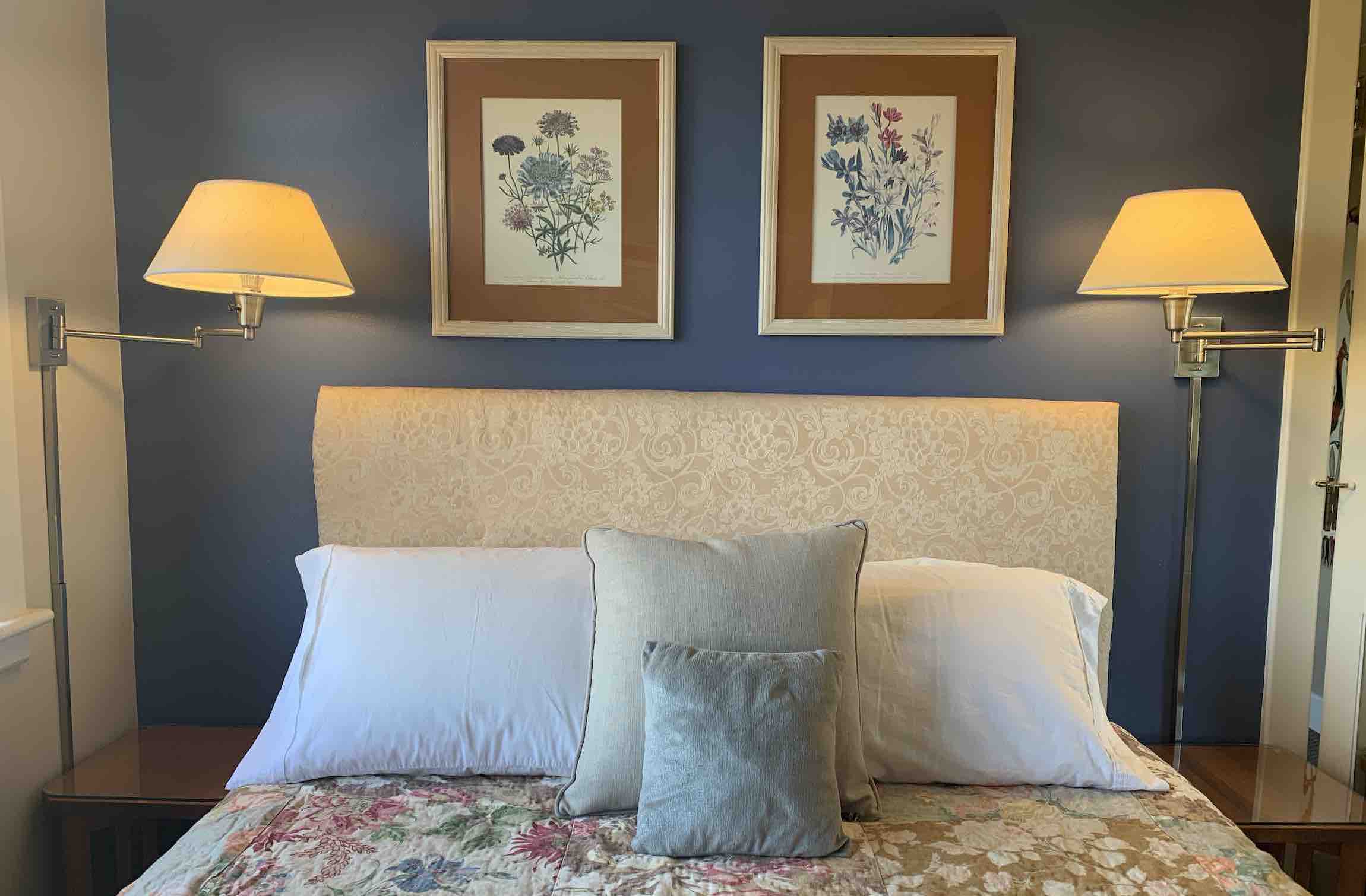 Spacious romantic room with spectacular views of the Cascades. Decorated beautifully and elegantly with Arts and Crafts furniture, vintage collectibles, bold blues and clay colors with nature and botanical prints. An inviting and cozy sitting area at one end of the room with a sleeper sofa and smart TV for wonderful nights in after taking in the day.