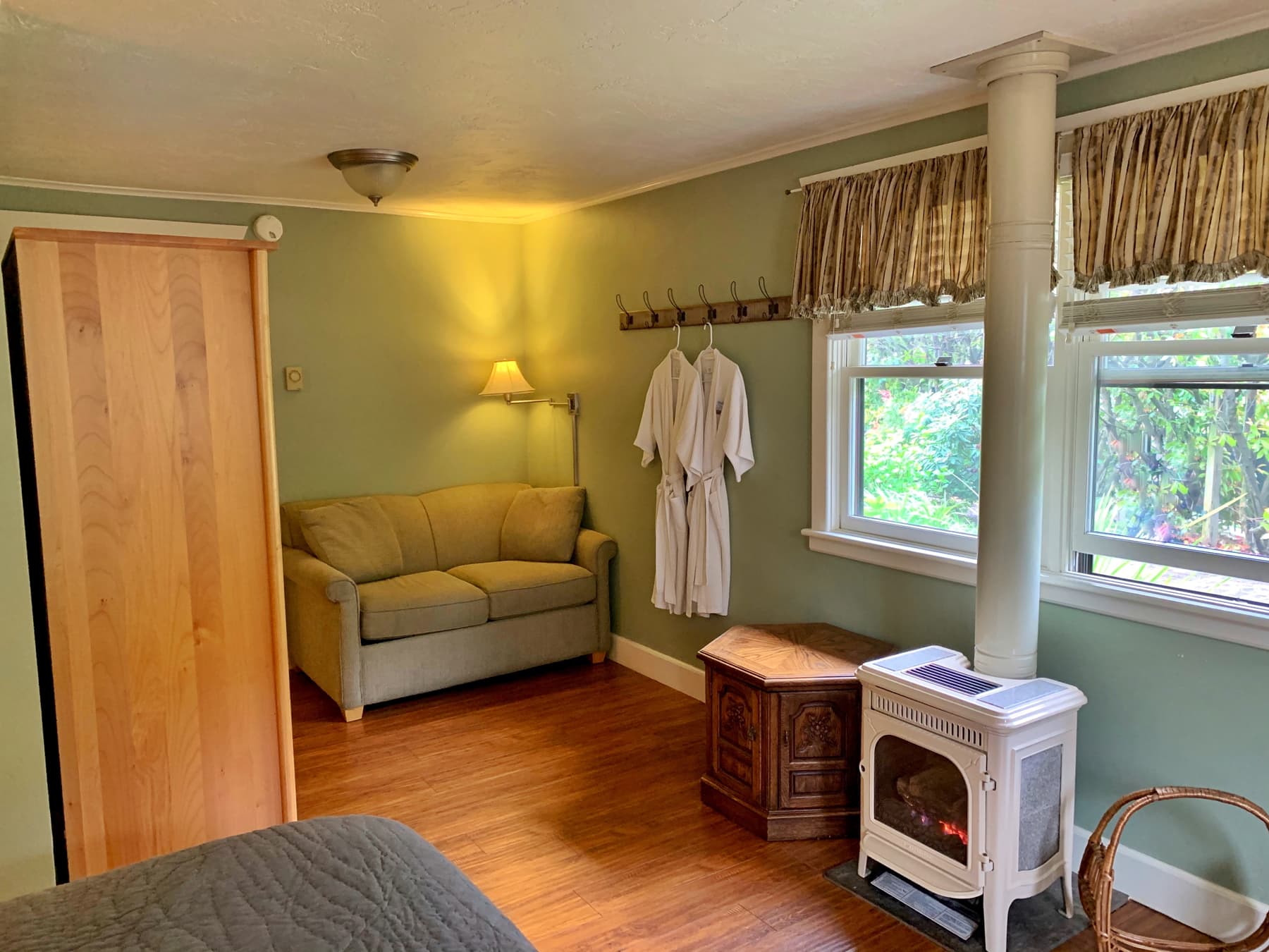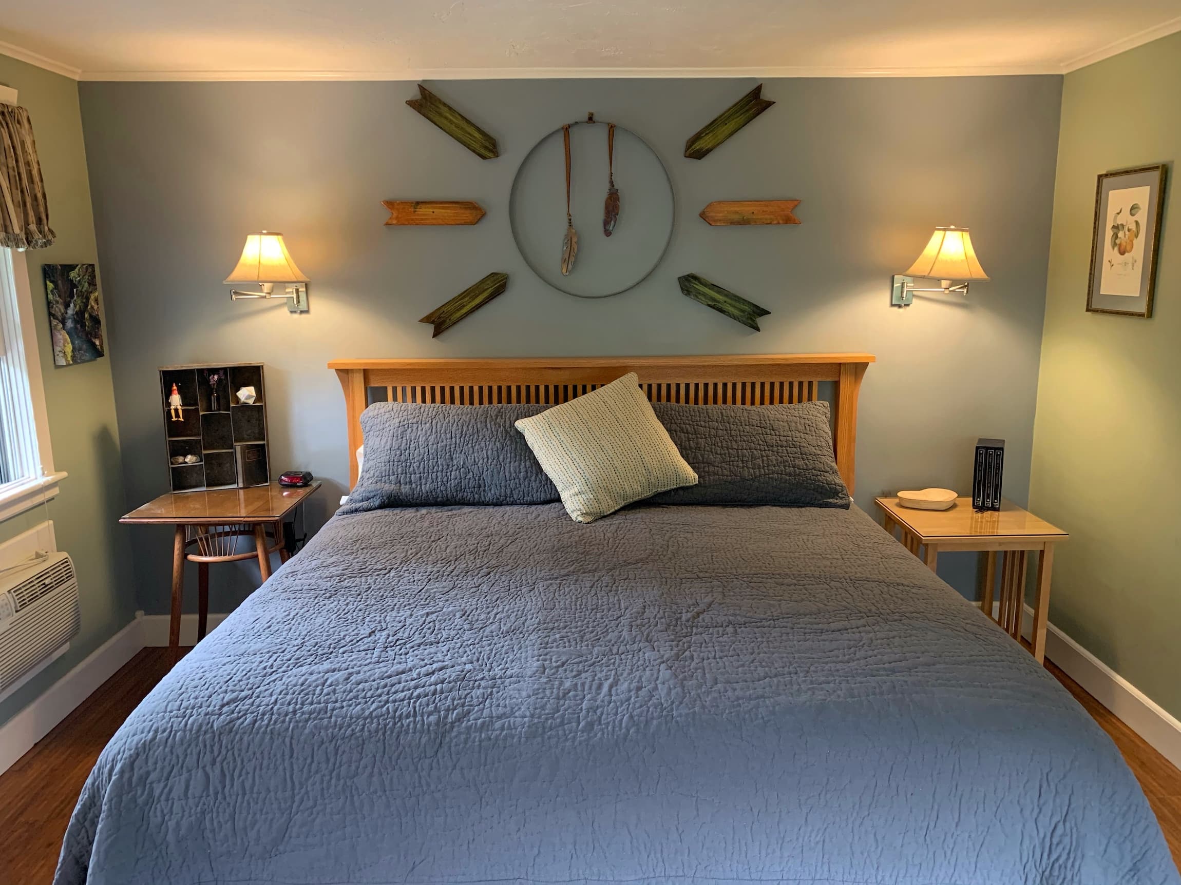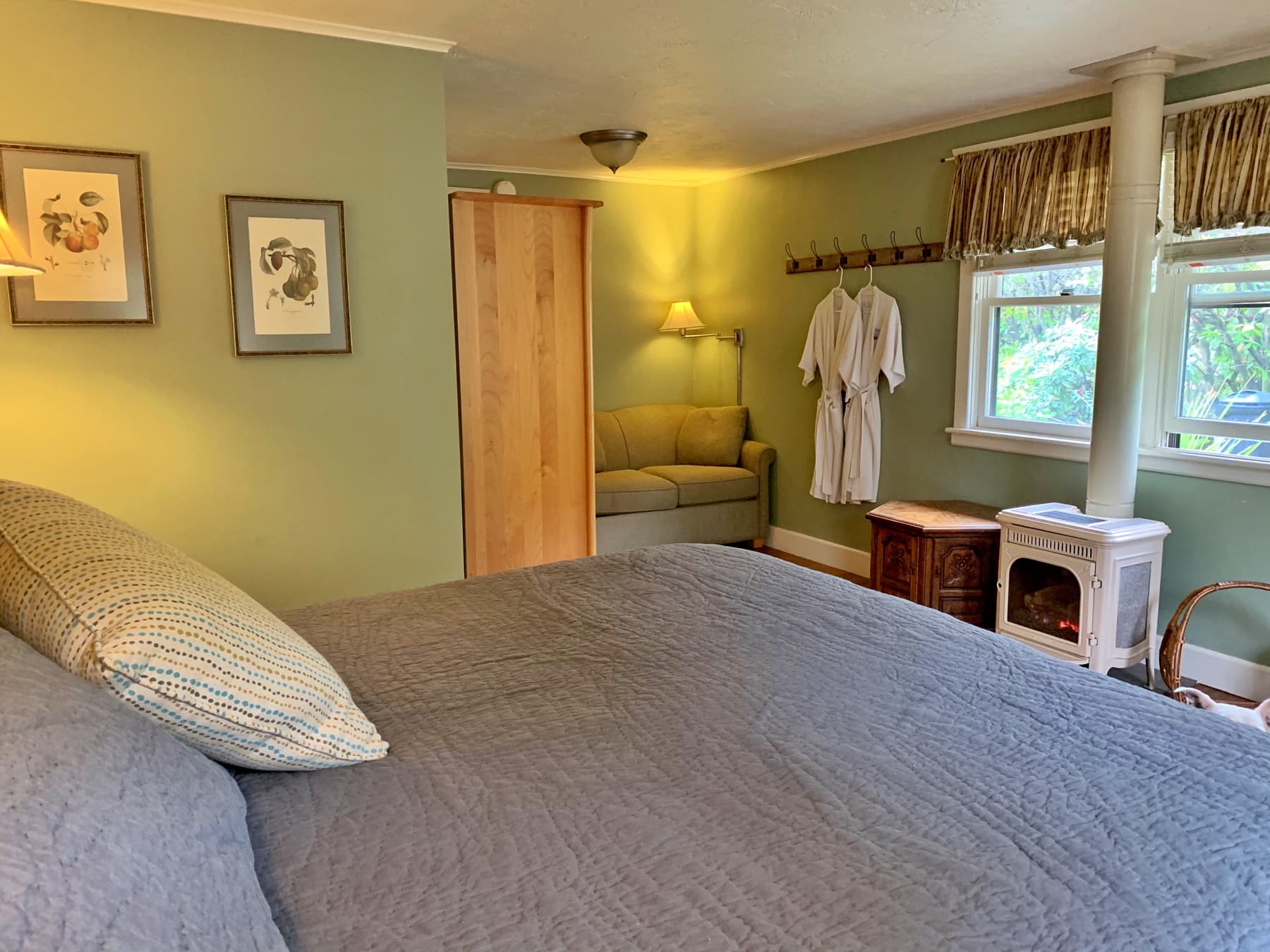Spacious suite-style room with marble and enameled freestanding fireplace and a private entrance onto the terraced rock garden. Decorated with an earthy, travel motif with upcycled custom art in warm and inviting colors in greens, greys and shades of blue. Small conversation/reading area at one end of room with a writing desk on the other. Comfortably accommodates up to three guests offering a king bed and an extra comfortable sleeper sofa bed.