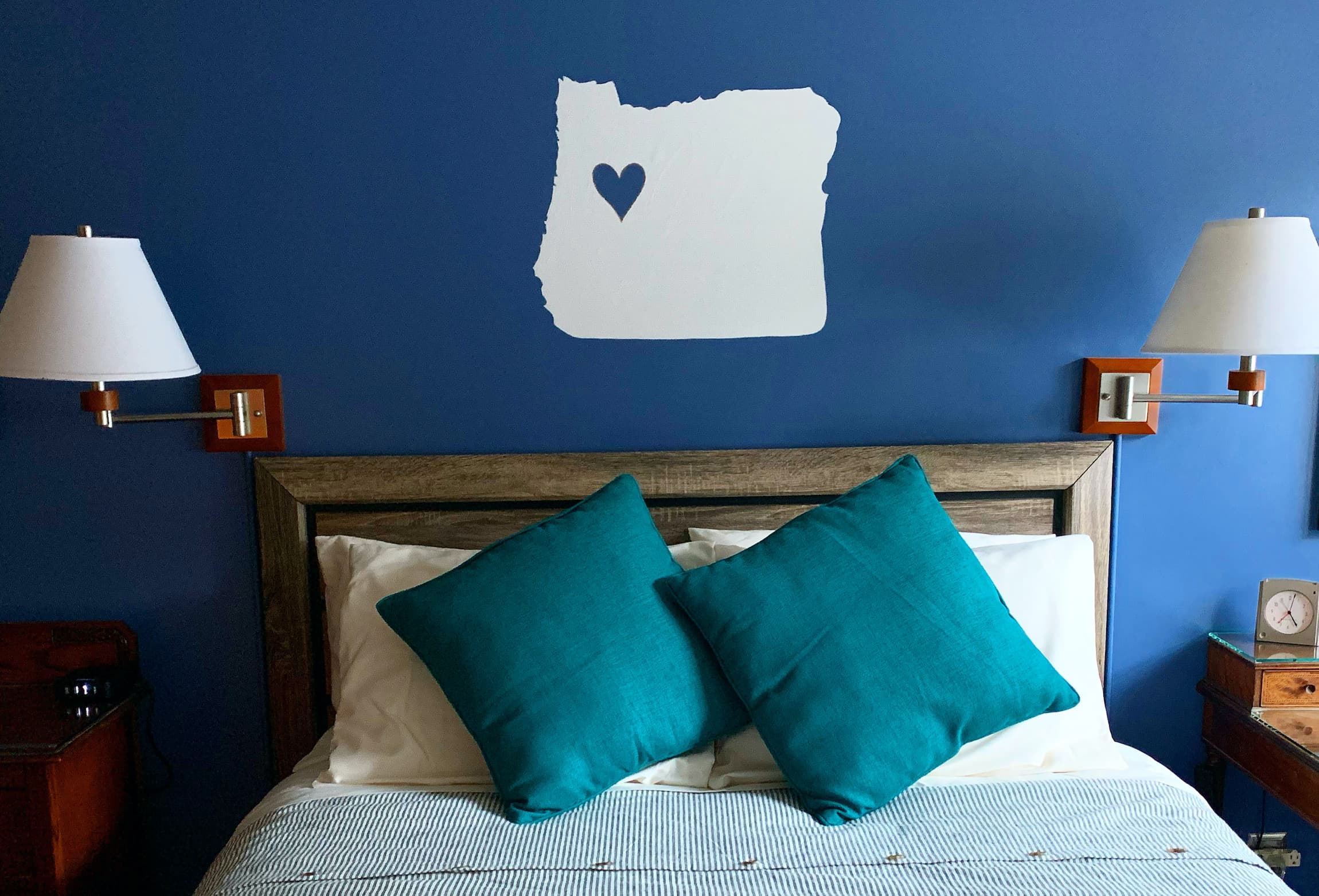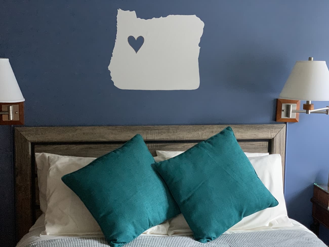 Cool and classic motifs in blues and grays give this room an airy and welcoming feel. Locally sourced and hand painted art gives the perfect feel to the space. Comfortably accommodates 2 in a queen bed.