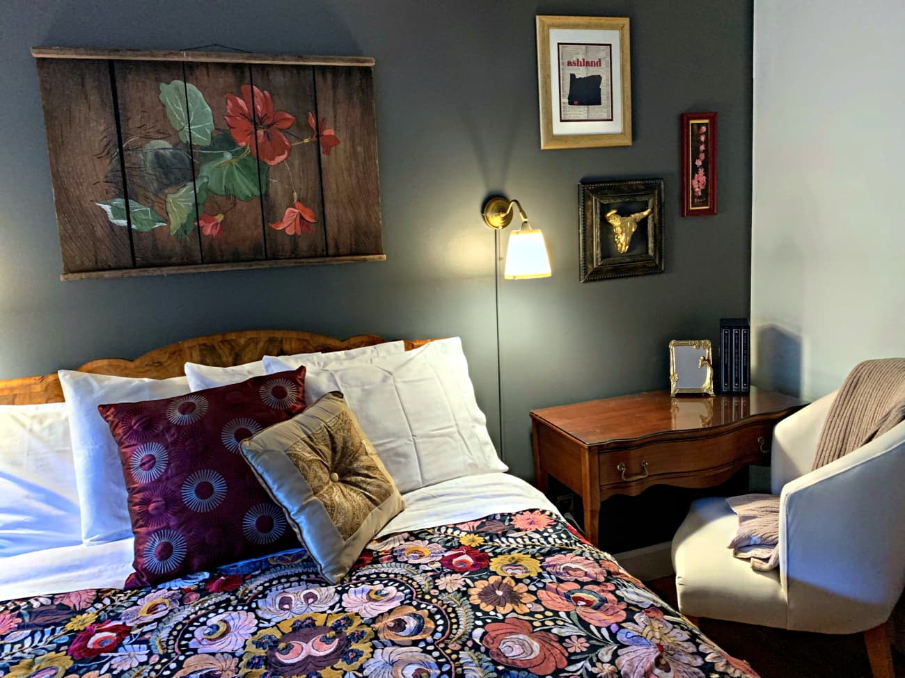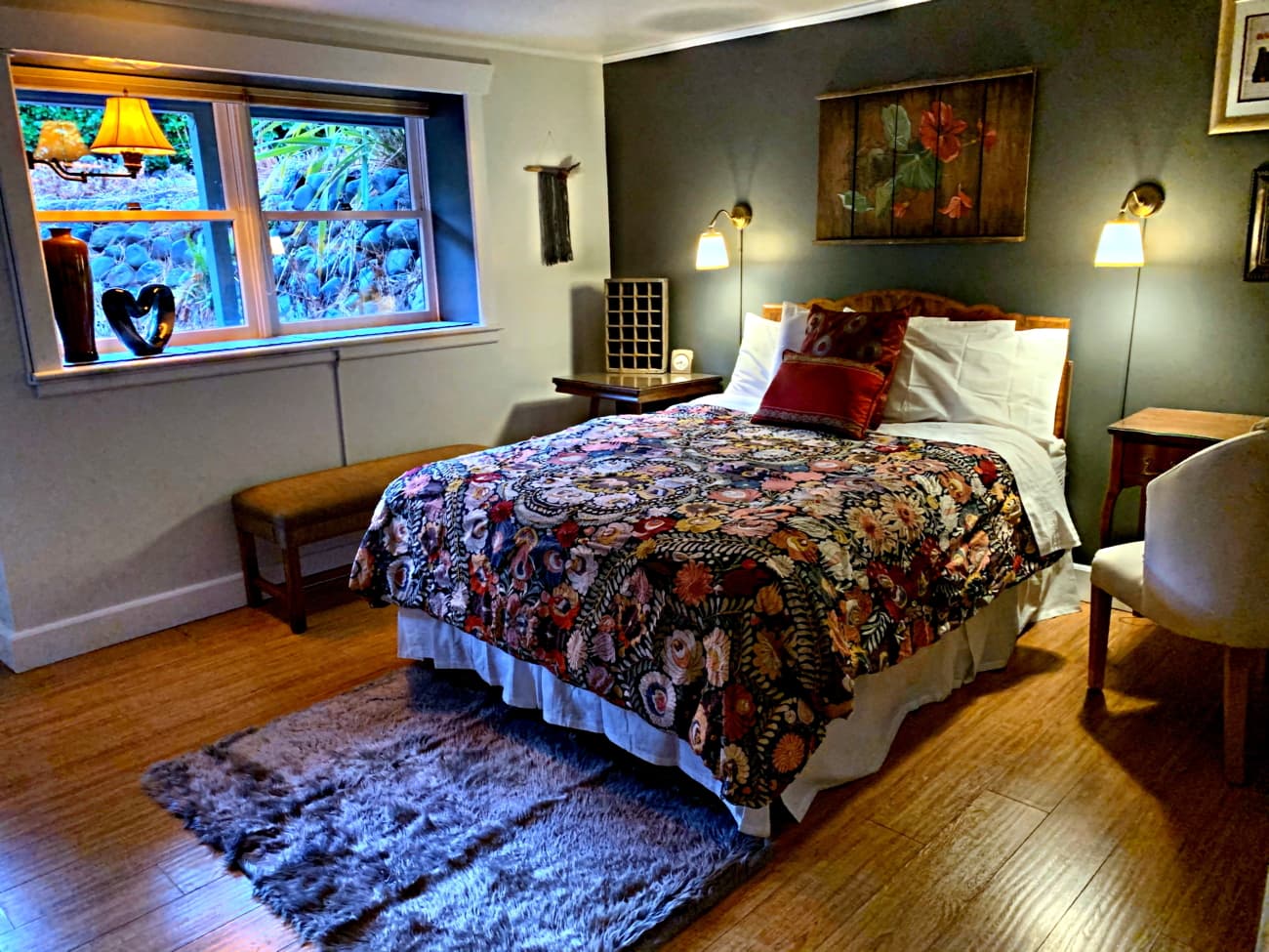 This warm, inviting room has a private entrance onto a terraced rock garden. Decorated in Vintage & Upcycled décor – in rich and pale tones of gray with vibrant accents and floral motifs.