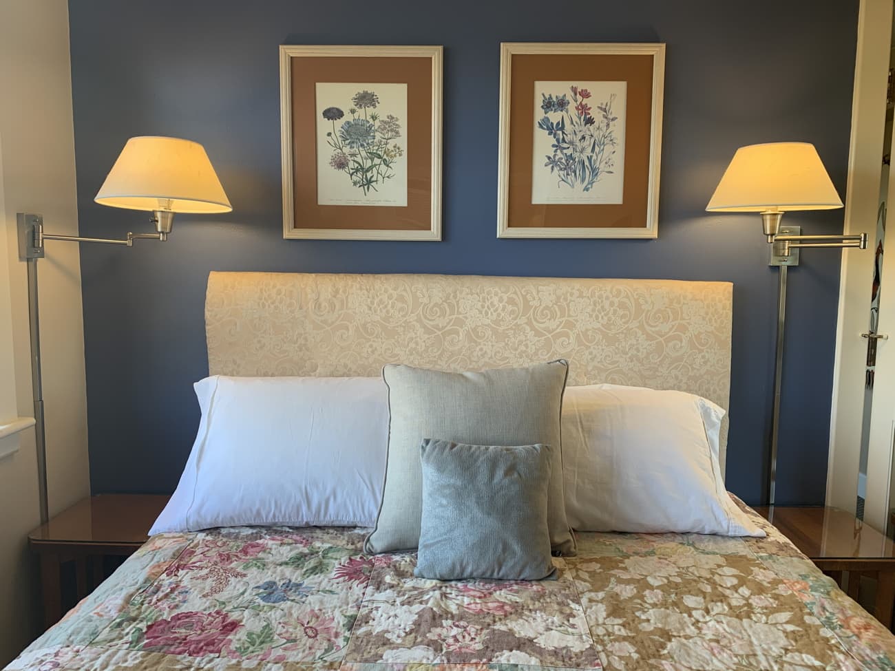 Spacious romantic room with spectacular views of the Cascades. Decorated beautifully and elegantly with Arts and Crafts furniture, vintage collectibles, bold blues and clay colors with nature and botanical prints. An inviting and cozy sitting area at one end of the room with a sleeper sofa and smart TV for wonderful nights in after taking in the day.