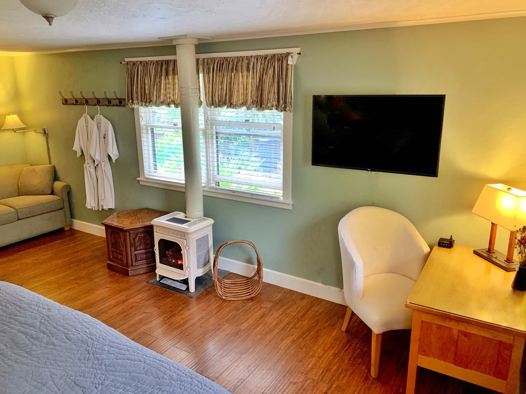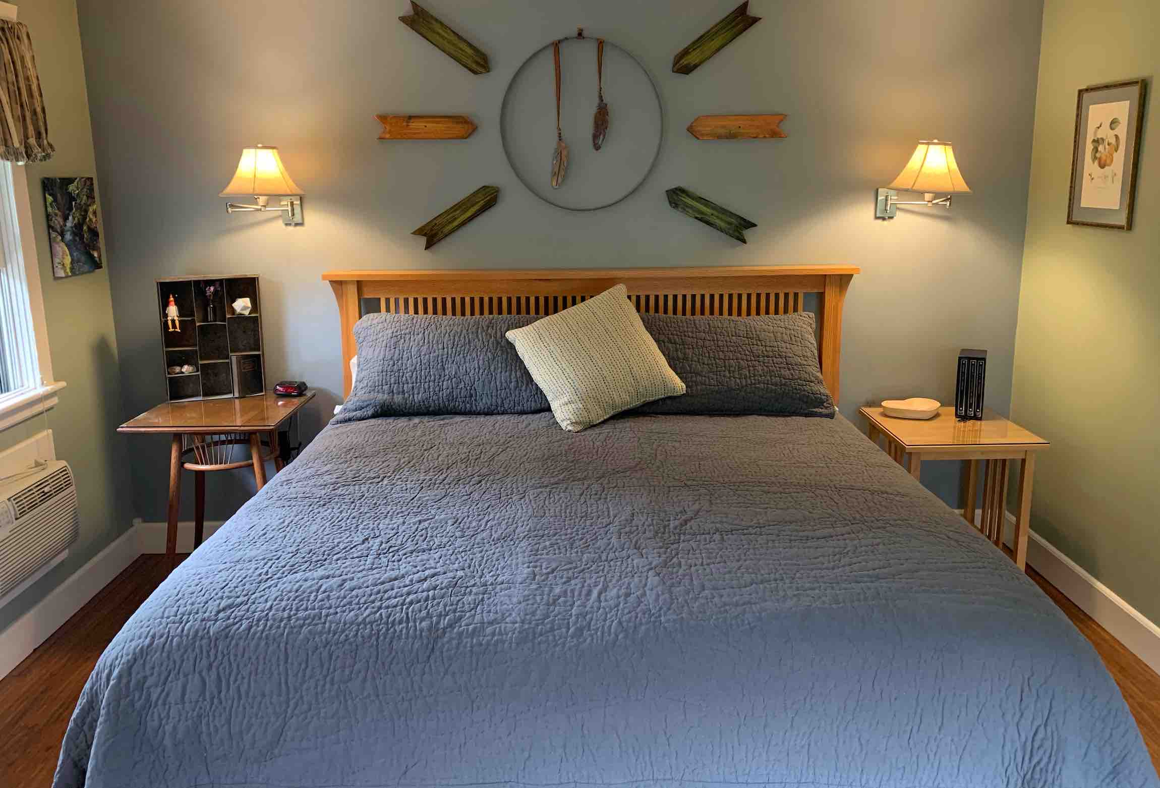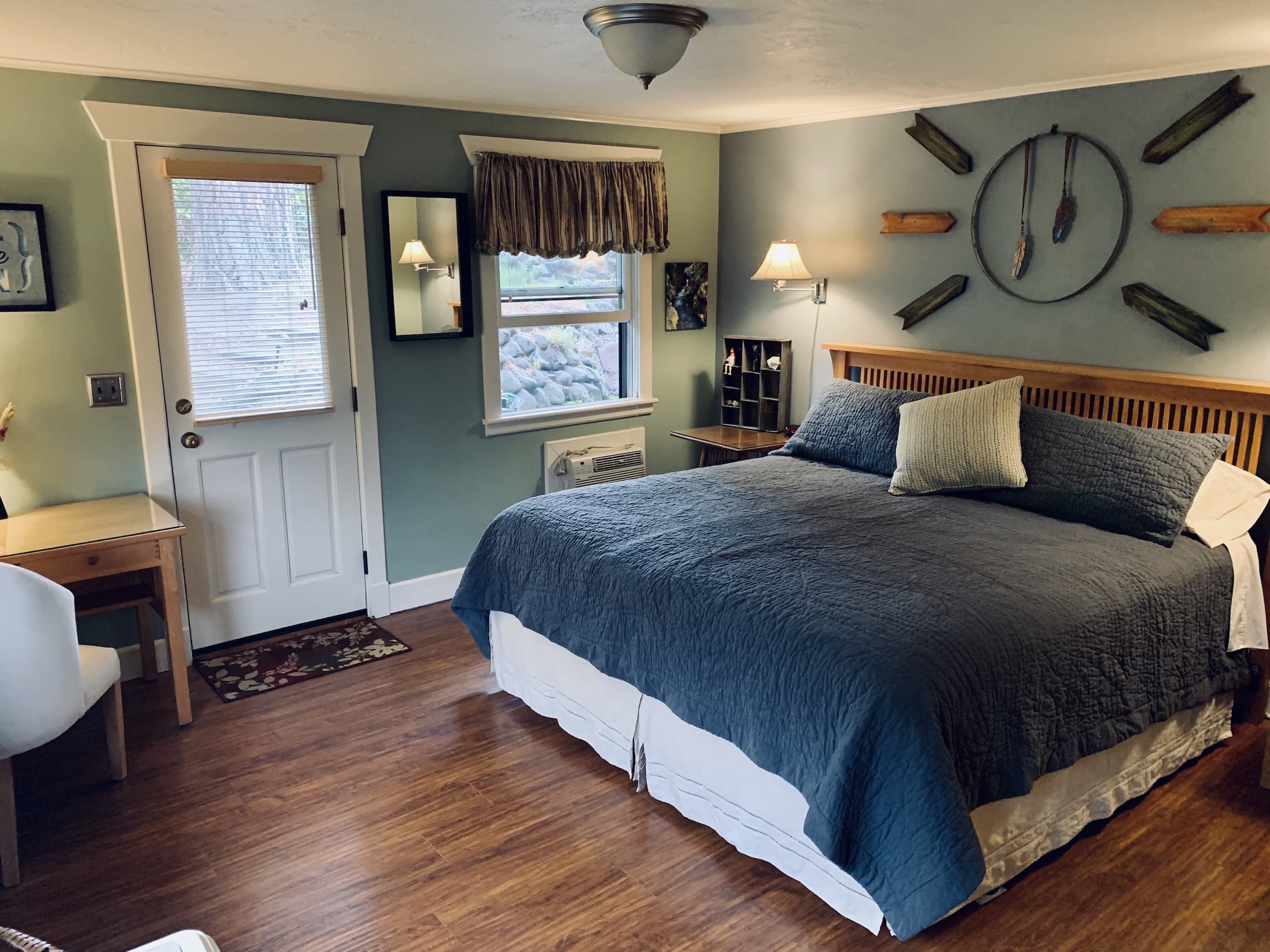 Spacious suite-style room with marble and enameled freestanding fireplace and a private entrance onto the terraced rock garden. Decorated with an earthy, travel motif with upcycled custom art in warm and inviting colors in greens, greys and shades of blue. Small conversation/reading area at one end of room with a writing desk on the other. Comfortably accommodates up to three guests offering a king bed and an extra comfortable sleeper sofa bed.