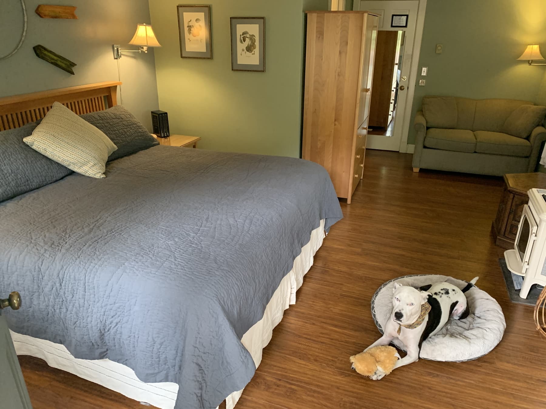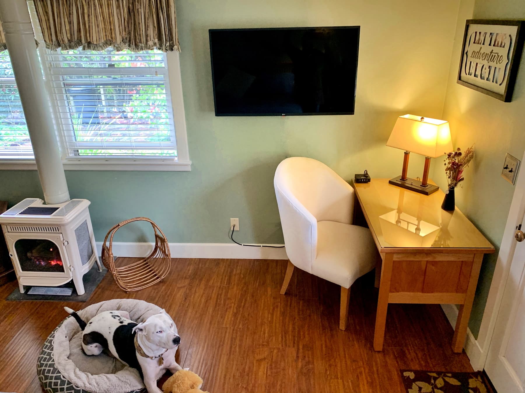Featuring essential amenities, individually controlled heat and air conditioning, air purifier, WIFI, Smart flat screen TV, and en-suite bathroom with shower/tub. Dog-friendly room on the garden level, with easy access to garden.