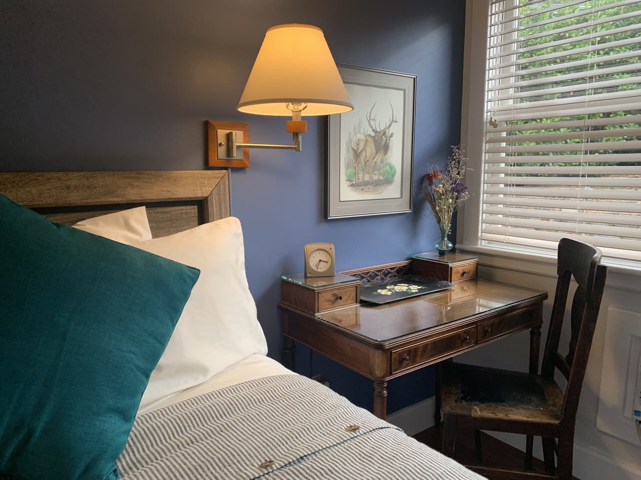 Elegantly appointed with writing desk and essential ammenties, individually controlled heat and air conditioning, air purifier, WIFI, flat screen TV, and en-suite bathroom with tub/shower. Dog-friendly room with easy outdoor access.