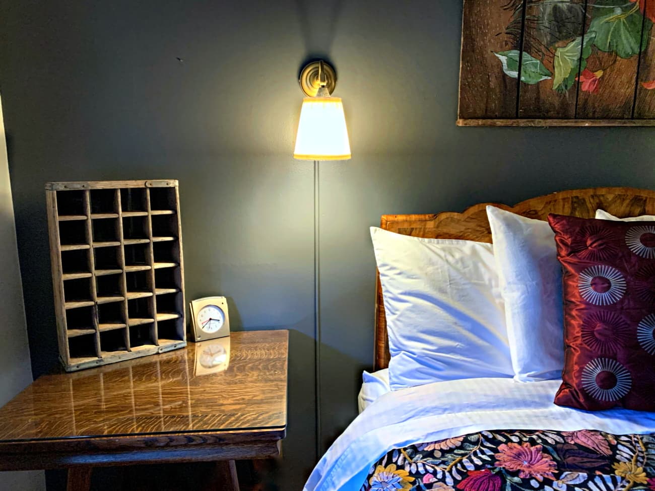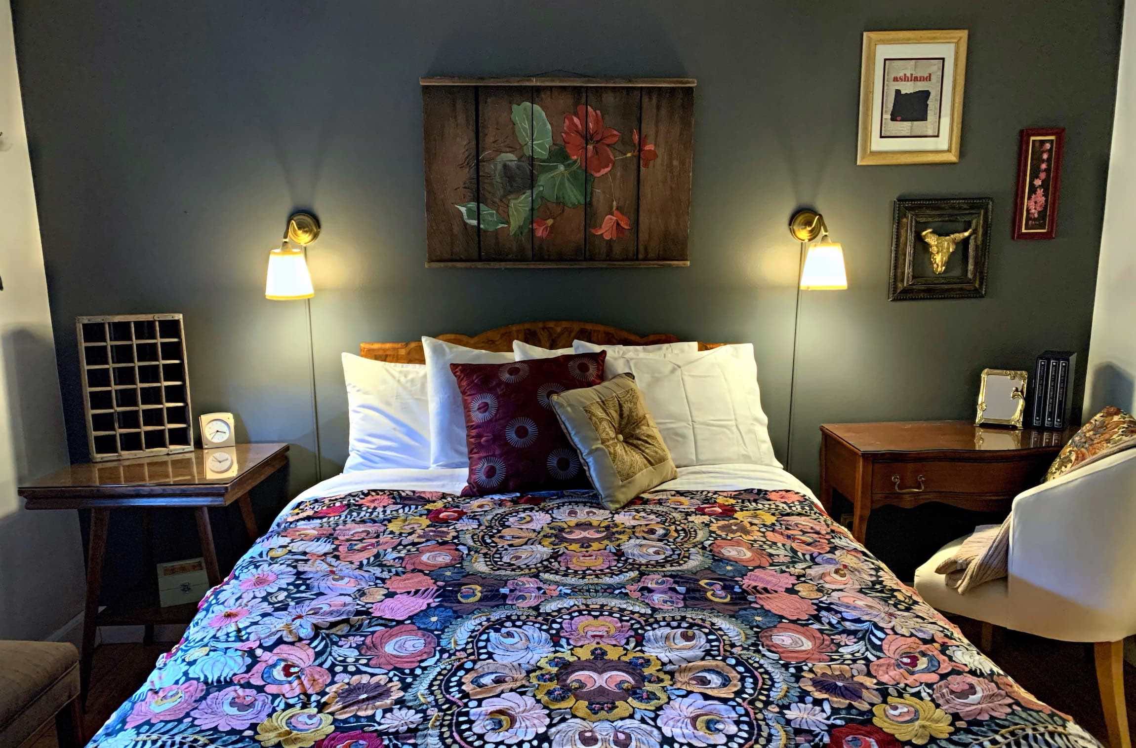 This warm, inviting room has a private entrance onto a terraced rock garden. Decorated in Vintage & Upcycled décor – in rich and pale tones of gray with vibrant accents and floral motifs.
